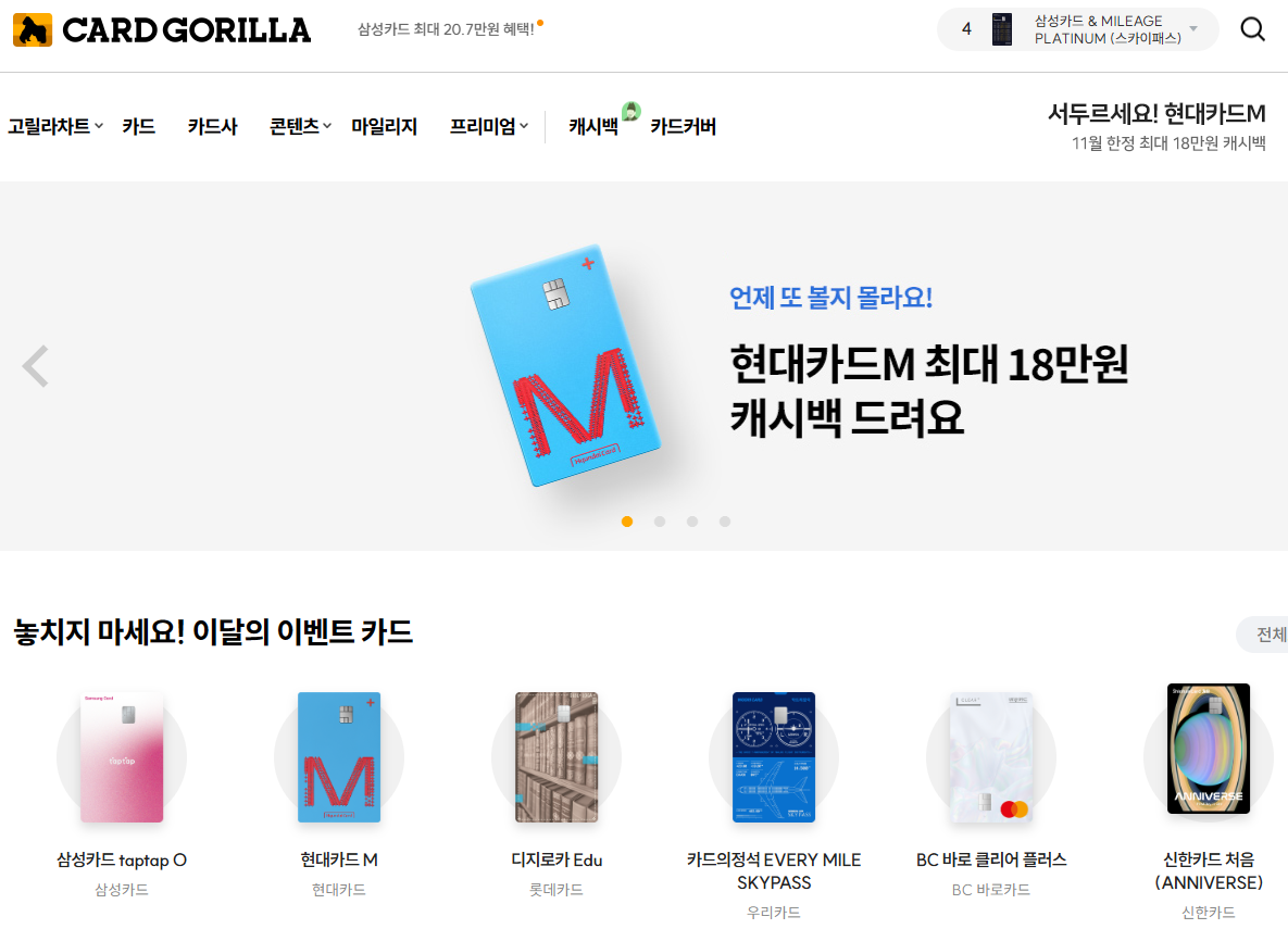 카드고릴라는 카드 선택 시 필수로 참고할 사이트로, 소비 패턴에 맞는 포인트 적립 카드를 쉽게 찾아보고 비교할 수 있습니다.